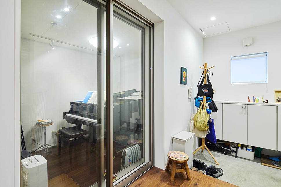 「防音室があるので趣味がある方や、自然が豊かなエリアなので子育て中のファミリーに向いていると思います。防音室は、専門の業者さんに引き渡し後に作っていただきましたが、無印良品さんと連携して、工事の詳細を決めて、家全体の雰囲気に合うように床材を統一しています。夜でもピアノを練習することがありますが、音は気になりませんね。リモートで会議が多い人には、書斎として使うのもいいかもしれないですね」。