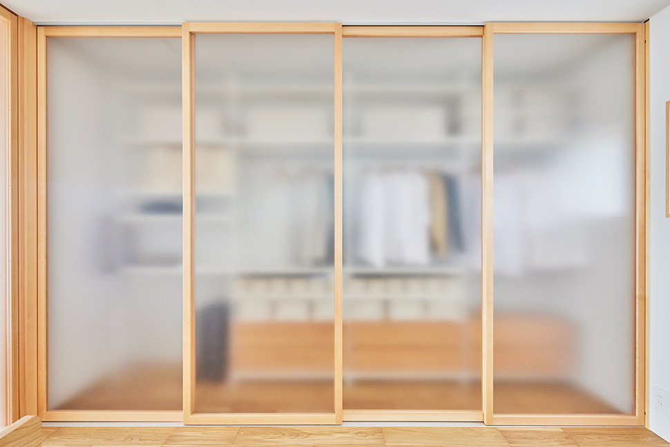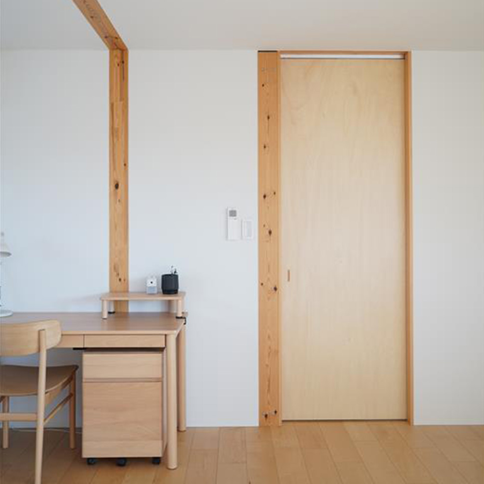 新仕様では、美しい構造材である柱や梁ともども、建具枠や引き戸の複数の線も消すことで、より感じの良い「余白」を生もうと考えました。