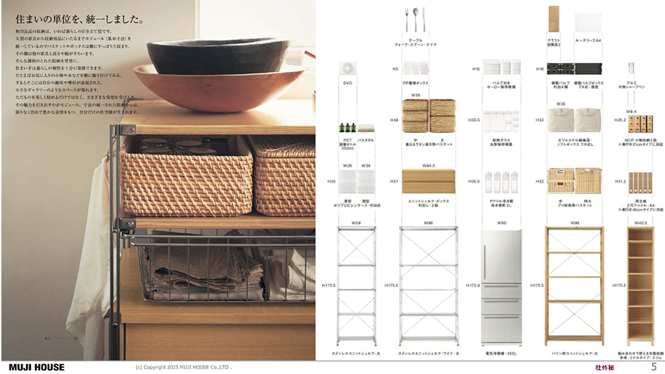 無印良品は、日常生活で使う道具を幅広くつくっています。いまはおよそ7,000品目とも言われます。しかも、ただ種類が多いのではなく、実は寸法のルール(モジュール)でつながっています。