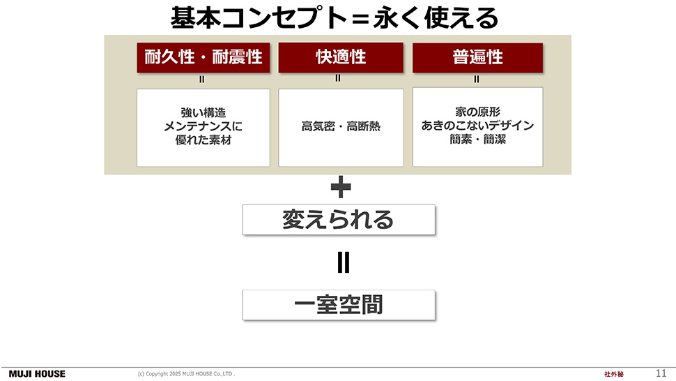 無印良品の家の基本コンセプトは「永く使える」です。そのために大切にしているのが、まず三つの基本性能です。