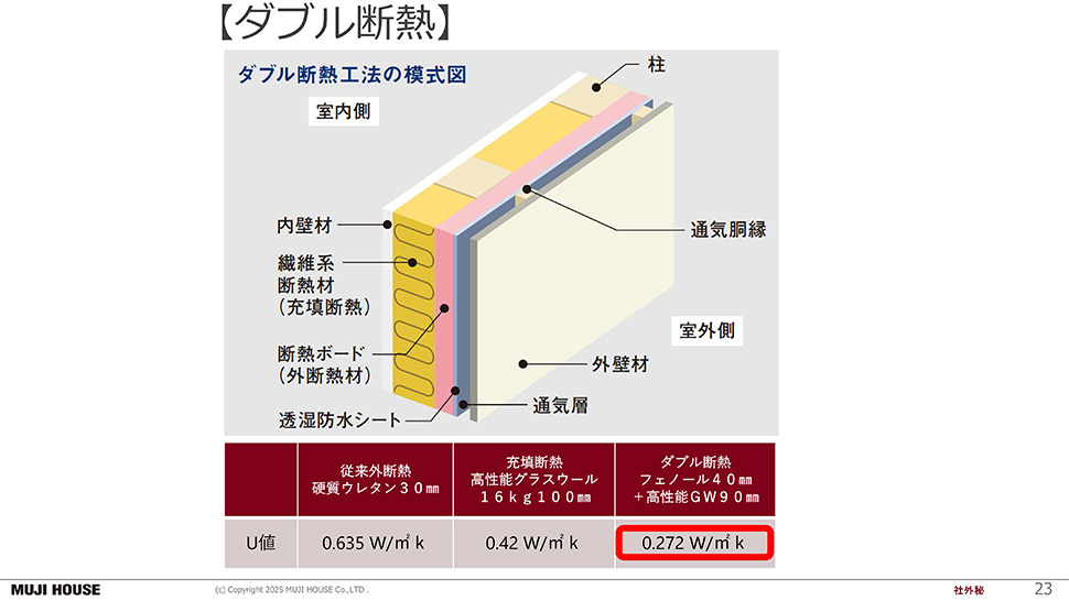 まず温熱性能です。木造軸組は柱と柱の間に断熱材を入れられる。木そのものも断熱性がある。その上で、外側にも断熱材を回す外張り断熱を組み合わせて「ダブル断熱」としています。