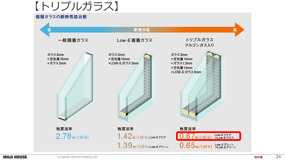 次に窓です。木の家や陽の家は窓が大きいので、窓の性能が重要になります。そこで標準でトリプルガラスを採用しています。アルゴンガスやLow-Eガラスなど、熱の出入りを抑える工夫を重ねています。