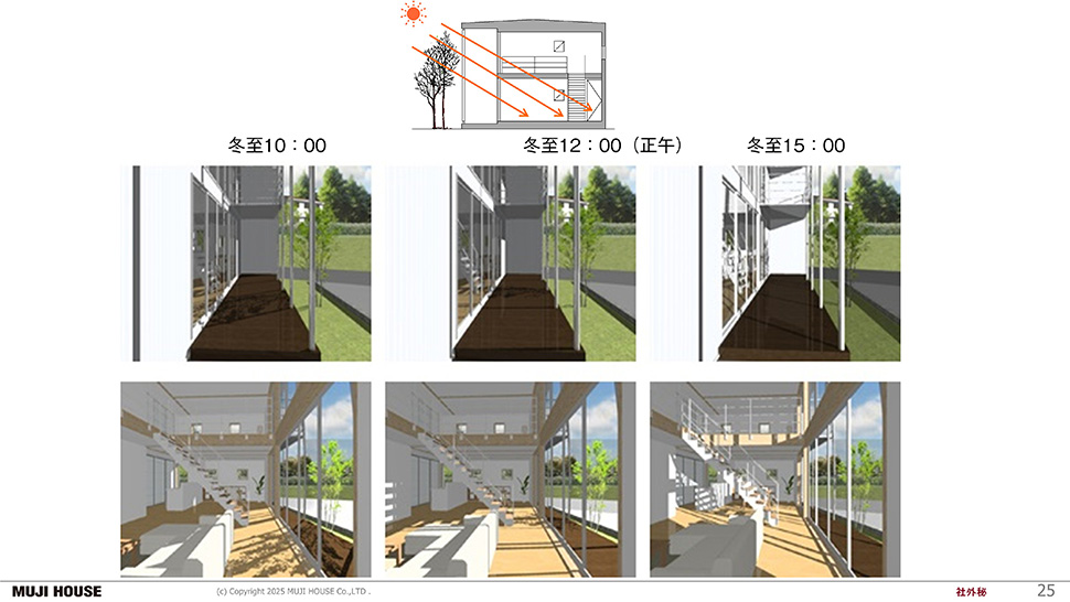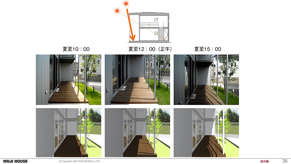 一方、夏は日射が強い。そこで軒を大きく出して、夏至の高い日射が室内に入りにくいように計算しています。シミュレーションだけでなく、実際の写真でも「入っていない」ことを確認できるようにしています。