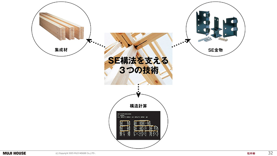 次に構造性能です。木材は計画的に植林と伐採を行えば再生可能な建材で、環境負荷の面でも意味があります。一方で木造軸組の弱点はジョイント(接合部)です。そこで接合部を金物で強化し、構造計算を前提にして、壁が少なくても成立する構造を目指しています。