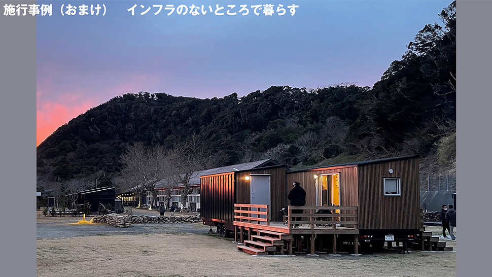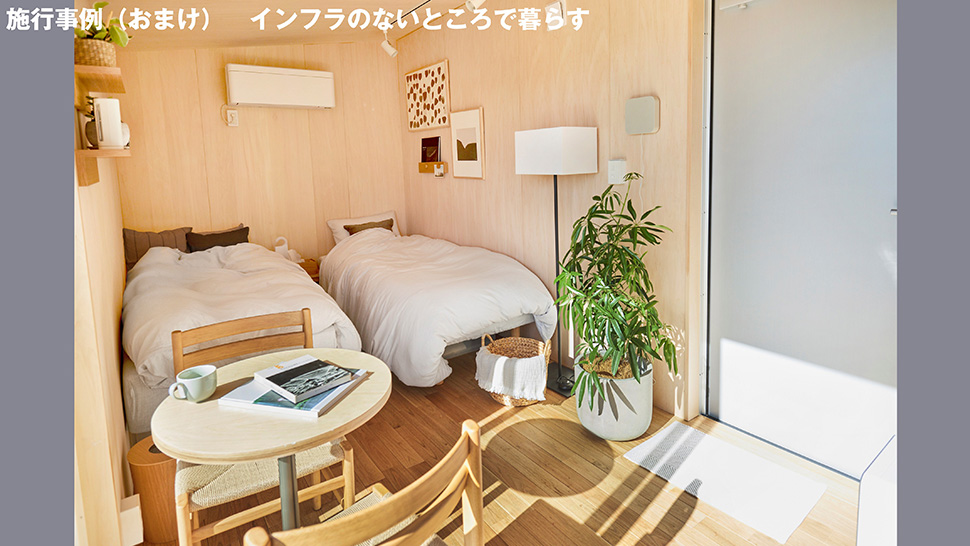 最後におまけとして、インフラゼロハウスの取り組みも紹介します。これは住宅というより車両(トレーラーハウス)に近い発想で、電気・水がない場所でも、置いた瞬間からエアコンが動き、トイレが使え、インターネットも衛星でつながる。水循環システムを積んだユーティリティ棟と組み合わせると、より生活に近づきます。