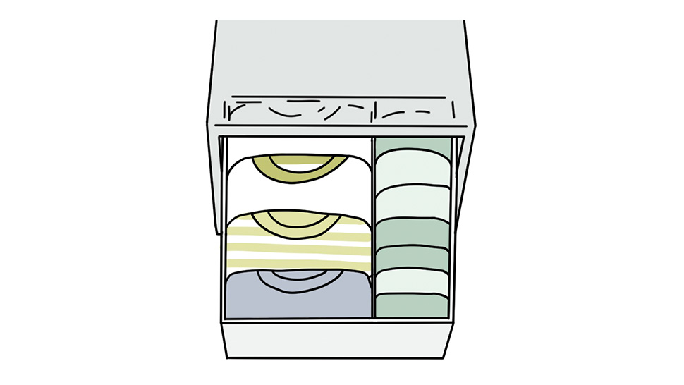 引き出しにたたんでしまう場合は、平置きで上に重ねるよりも、立てて並べると取り出しやすく、収納量も増えます。Tシャツやデニムなど厚みがある素材であれば、それぞれの衣類がストッパーとしても機能します。倒れてしまうことが気になる場合は、ストッパーを活用します。