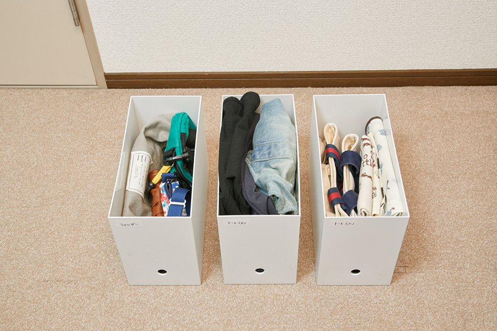 バッグ類はファイルボックスなどに入れて仕切っておくと、無駄なスペースを取らずにきれいな形を保つことができます。布製のバッグは、クルクルと丸めて棒状にするとコンパクトに収納できます。