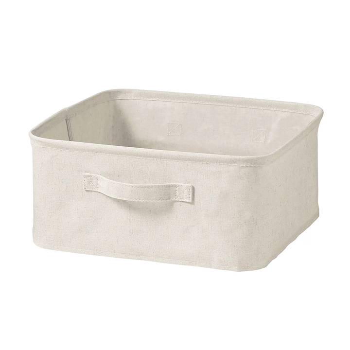 生地の内面をコーティングしたコンパクトにたためる布製ボックスで、整理しにくい小物やおもちゃなどをまとめて収納するのに便利です。