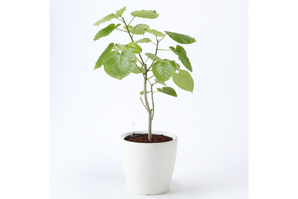 「大きな葉と白っぽい茎が特長のウンベラータは、お部屋にもなじみやすい品種です。季節の変わり目などに葉が落ちるので、お手入れを考えると中鉢程度がおすすめです。葉が落ちても枯れるわけではなく、新芽が出てきます。変化のあるグリーンなので育てがいもあります」