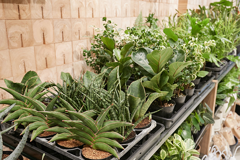 無印良品では多彩な品種のインテリアグリーン(観葉植物)やグリーンを育てるために必要なアイテムを取り揃えています。また、「無印良品 有明」では専任スタッフがご対応する「GREEN&FLOWER」コーナーを常設。育てることが不安な方も安心してお買い求めいただけるよう、品種に応じた育成のコツをご紹介しています。