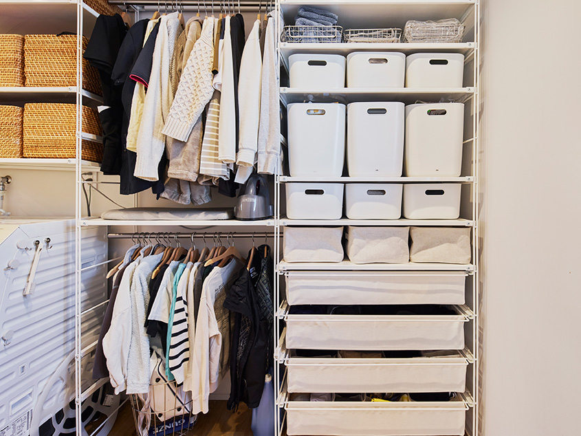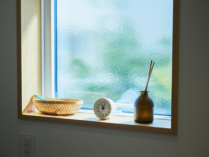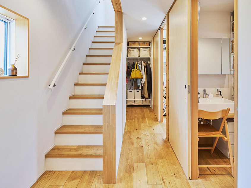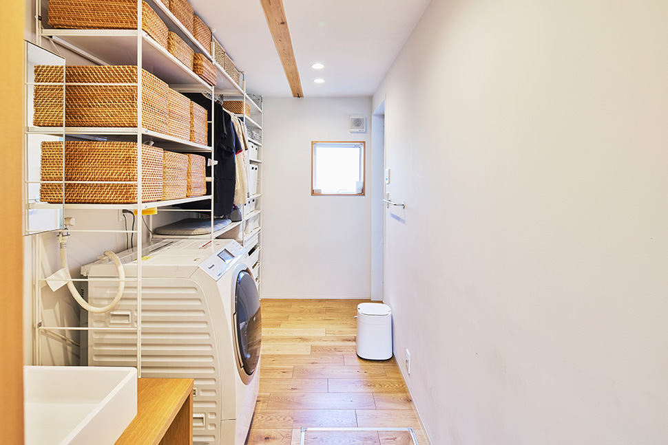 「以前の住まいでは家事全般で動きにくくてもどかしい思いをすることが多かったので、動線には気を配りました。キッチンは家族と向き合いながら料理できるアイランド式を選びました。洗面所は玄関を入ってすぐに入れる場所に、広めに設けました。洗濯して乾燥させた服をかけておけるスペースを確保して、身支度もしやすくしたかったんです」(奥さま)