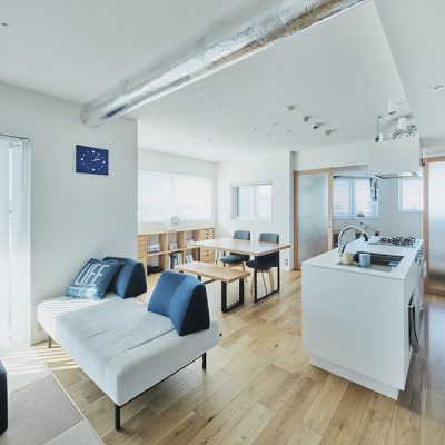千葉県市川市のマンションの一角にあるTさんご夫妻の住まいは、「MUJI INFILL 0」によってリノベーションされたお宅。広々とした一室空間のリビング・ダイニングは、淡い青を基調にした壁面と、木の質感を生かした床材や家具が、穏やかなコントラストを描き、落ち着いた雰囲気を醸し出しています。