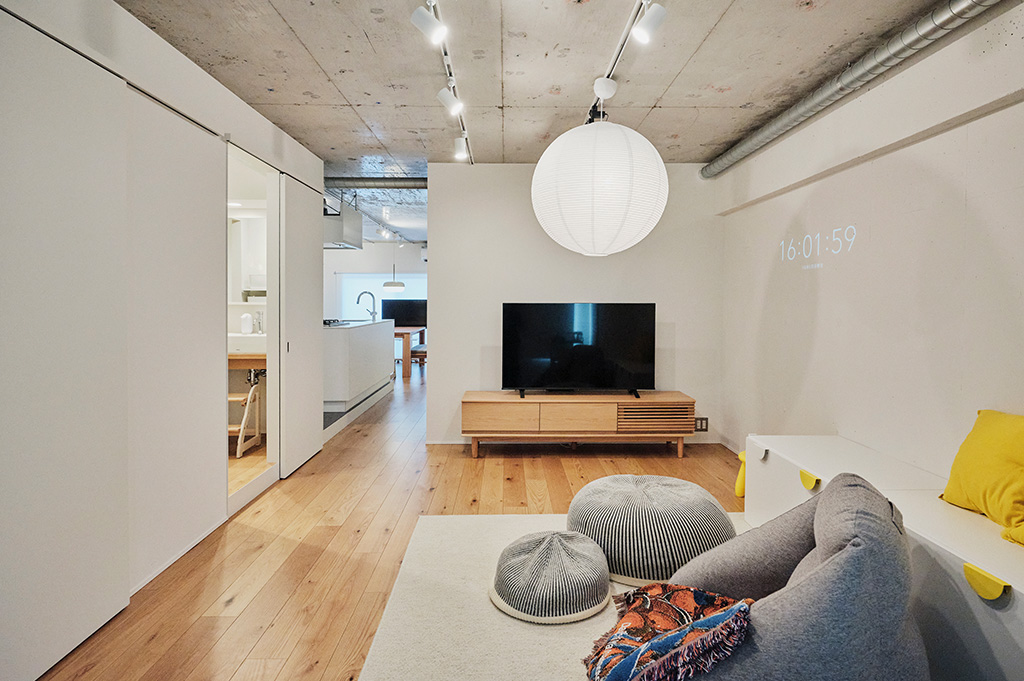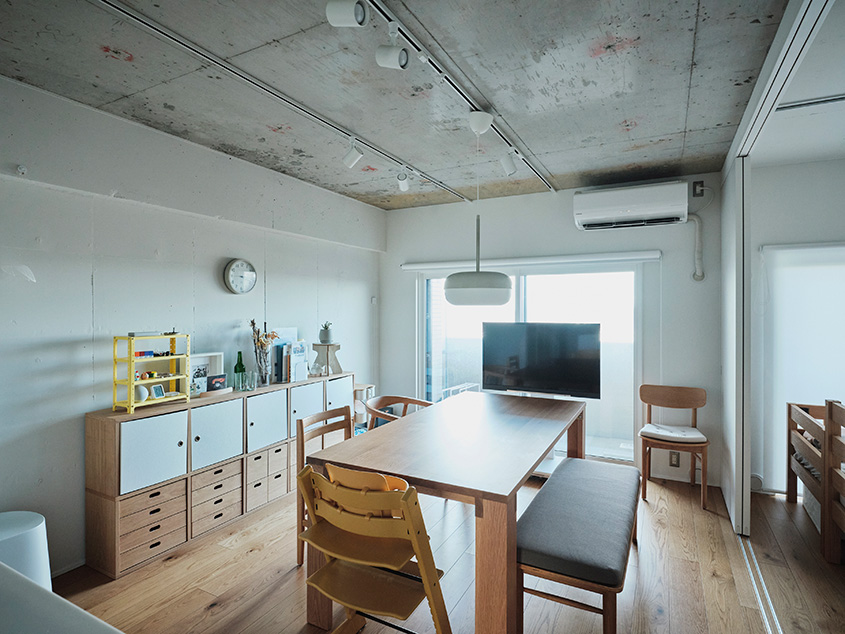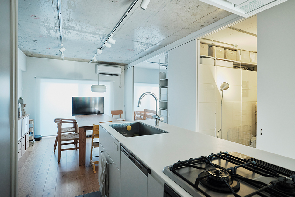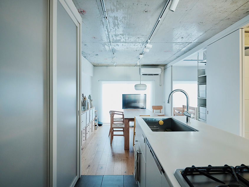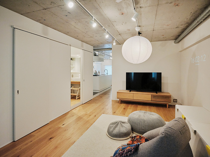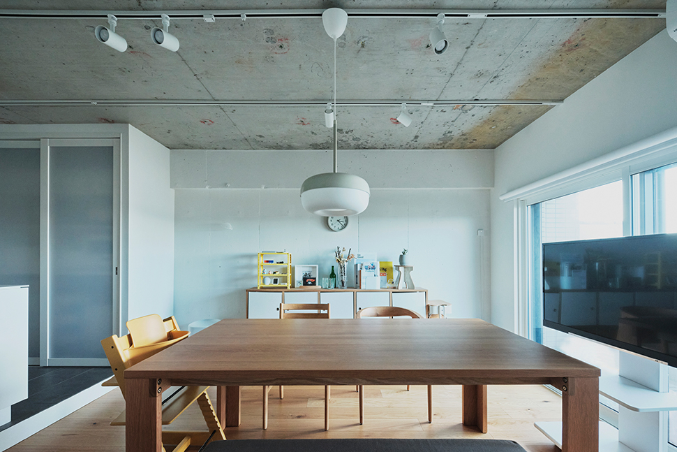 東京都町田市の住宅街に建つマンションの一角にあるK邸は、「MUJI INFILL 0」によってリノベーションされた住まい。コンクリートをそのまま現した天井と白く塗装された壁、表情のあるフローリングの調和がとれた、統一感と開放感のある空間です。