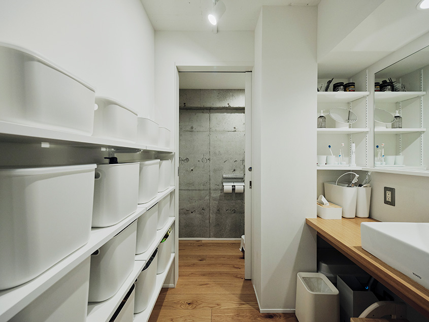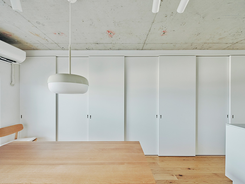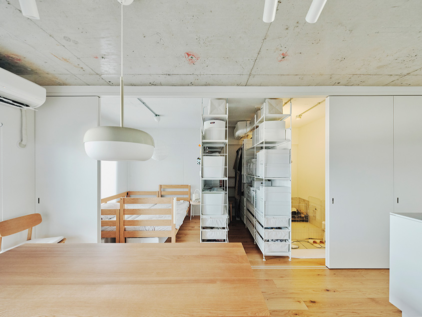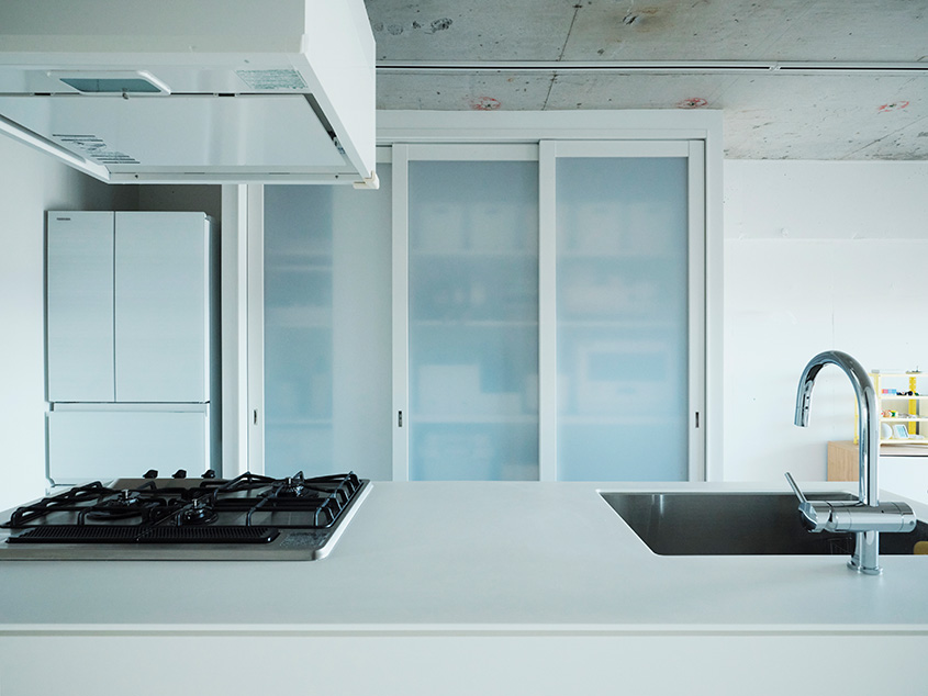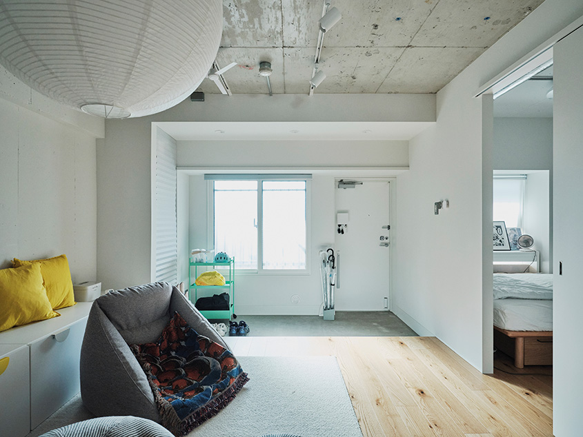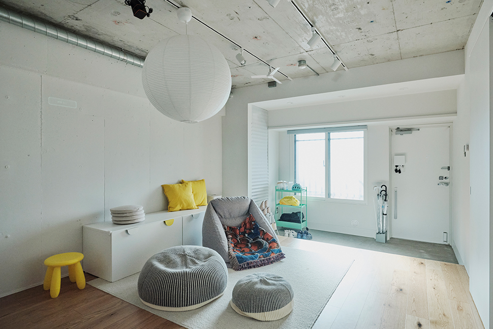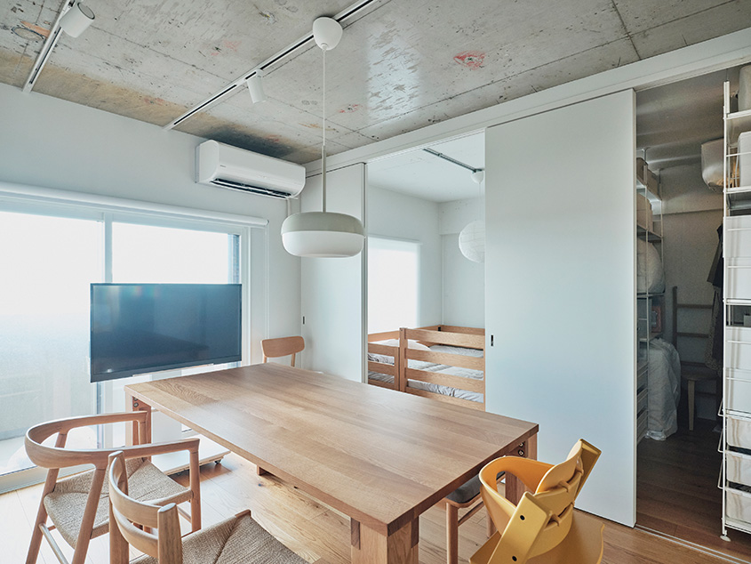 東京都町田市の住宅街に建つマンションの一角にあるK邸は、「MUJI INFILL 0」によってリノベーションされた住まい。コンクリートをそのまま現した天井と白く塗装された壁、表情のあるフローリングの調和がとれた、統一感と開放感のある空間です。