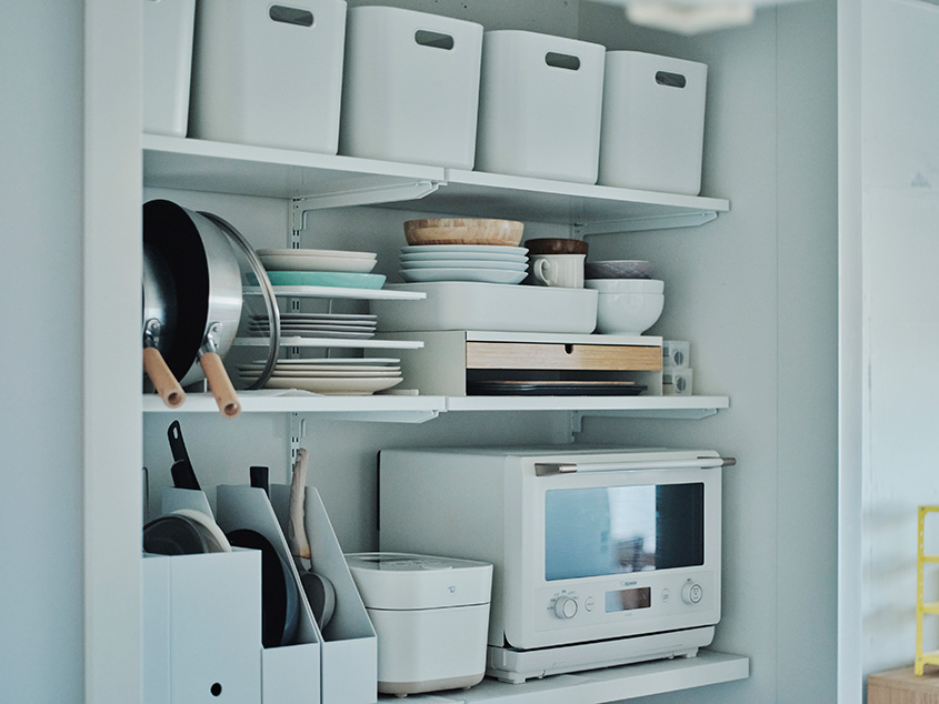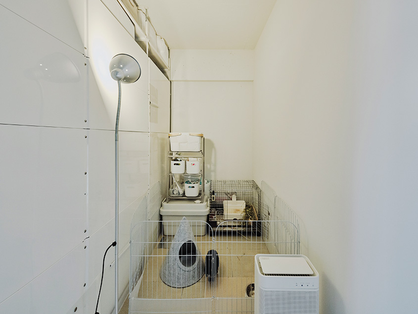 「折に触れて模様替えをしています。うさぎのスペースを確保するためにシェルフを動かしたり、ものを取りやすくするために収納の棚の位置を変えたり。レイアウトを変えることで、いい気分転換にもなっています」(奥さま)