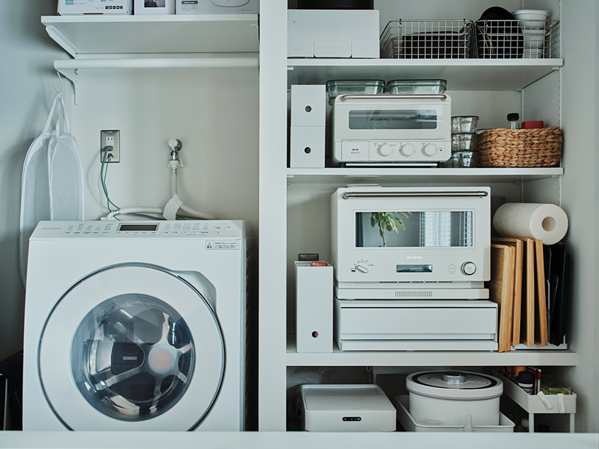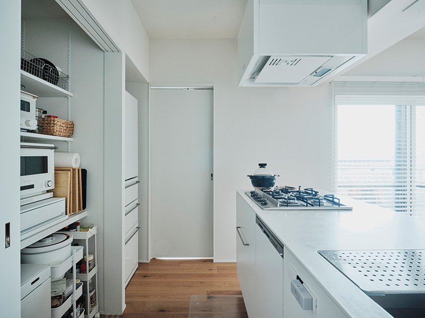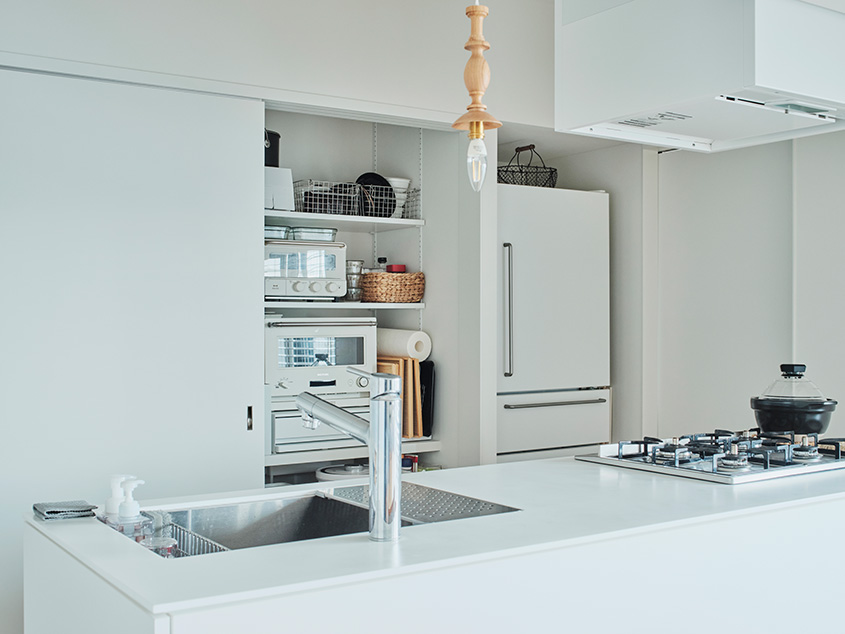 「キッチン周りは特に気を配りました。以前はキッチンが独立したスペースにあったので、家族と会話がしにくい上に、動線が確保されていなかったので、リビングダイニングに対面する形のアイランド型にしました。さらに、アイランドキッチンの後ろに冷蔵庫、レンジ、トースター、サイドの棚にパントリー的なスペースを確保していただきました。背後にある洗面脱衣室に洗濯機も設置することで、水を使った家事全般がストレスなく行えるようにしました」(奥さま)
