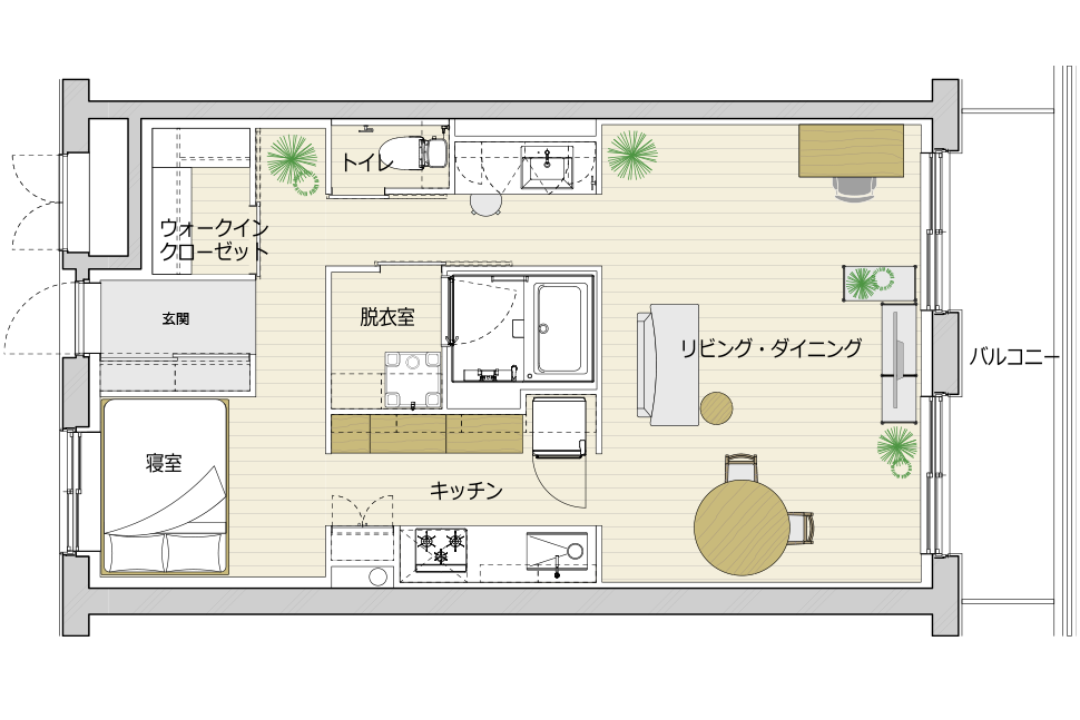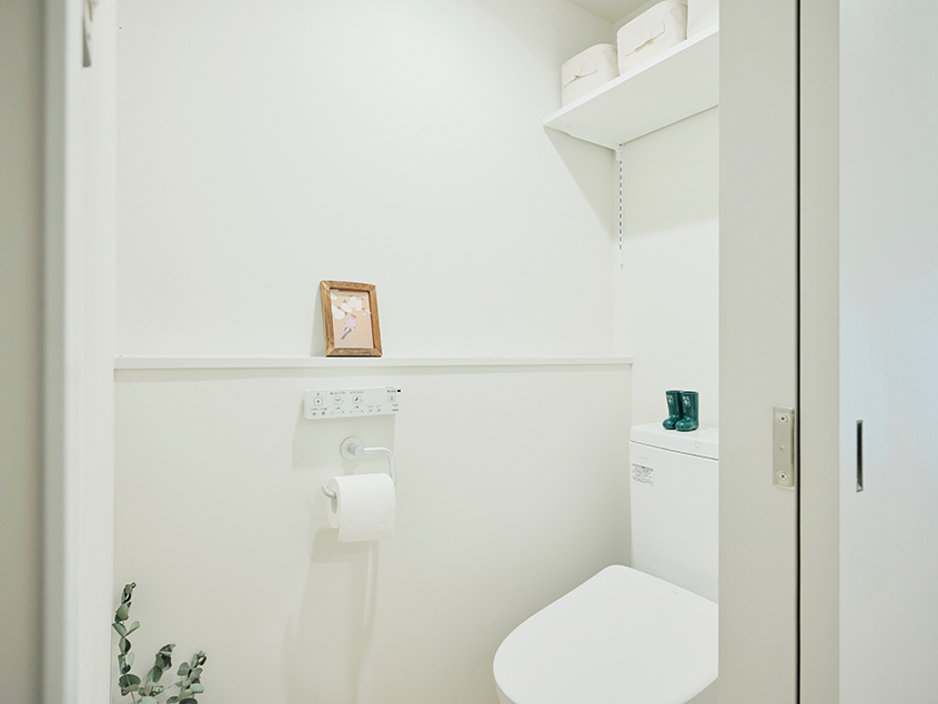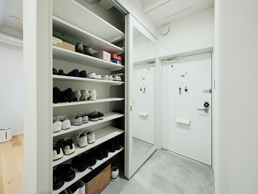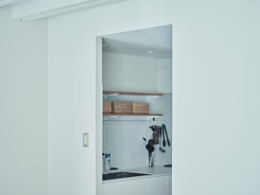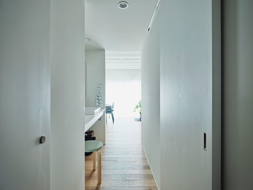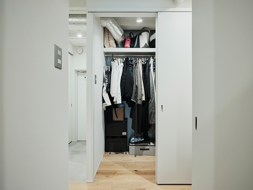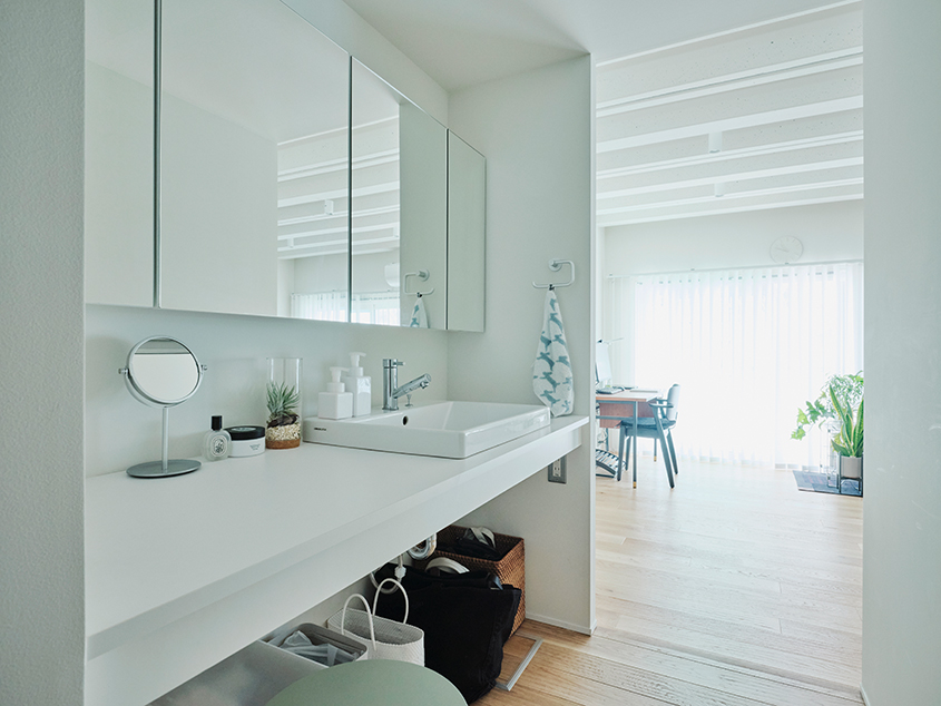 「リビングダイニングを広くするために、浴室を住まいの真ん中に置くような間取りにしました。あと、ウォークインクローゼットも含めて『隠す』収納にしました。あまり主張の多い感じのデザインにはせずに、好きなものを自由に置けるような空間にすることを意識しました」