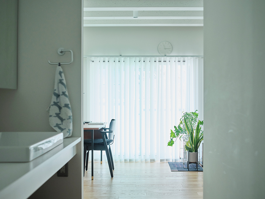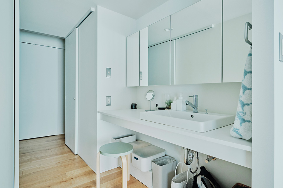 「リビングダイニングのソファでゆっくり過ごすことが多いですね。あと意外に好きなのは洗面所で過ごすひととき。お気に入りの黄緑色の椅子に座って、コーヒーを飲んだりタブレットで映像を観たりしながら身支度する時間は、なんとも言えず落ち着きます。生活動線も確保されているので、家事などをしていてもストレスを感じません」