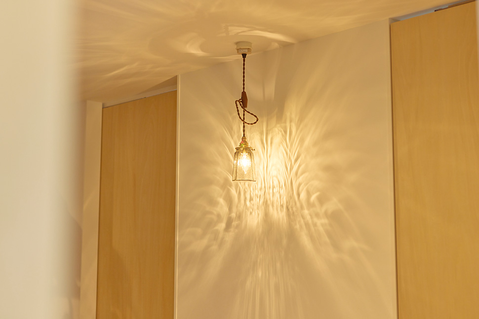 白の壁紙がどんな家具にも食材にも映えることに感動した奥さま。もともと持っていた無印良品の家具やアイテムにも合うので、無印良品の店舗に行くのがさらに楽しくなりました。ご主人は白の壁に映えるダウンライトのオレンジ色でリラックスできる居心地の良さがお気に入り。