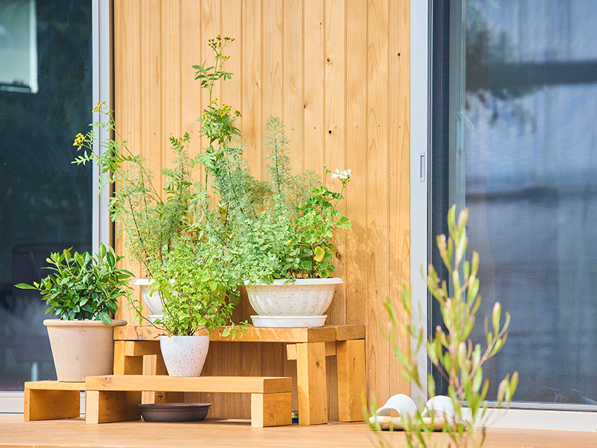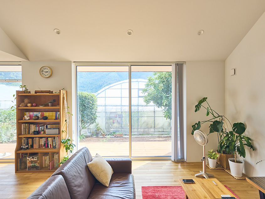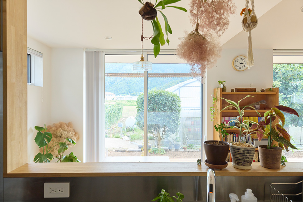 もともと植物や畑仕事などが好きなご夫婦。家作りの際に敷地に植えていた木はほとんど伐採し、草花は移植したり、思い入れのあるものだけ少し残しました。朝早く起きて畑のパトロールや手入れをして朝食、仕事後にまた畑を巡り、夜は2人で毎晩窓からの風景を楽しみながらの晩酌が何よりのご夫婦の楽しみなんだそうです。