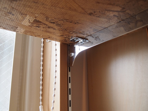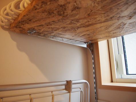 どういう風にできてるのかといいますと、この銀色レールを壁の上から下まで通します。そんでレール上にポンポン開いてる穴に、板からでてるフックをひっかけているのだ。