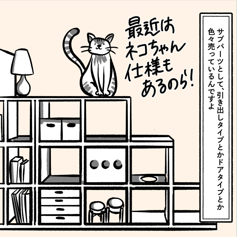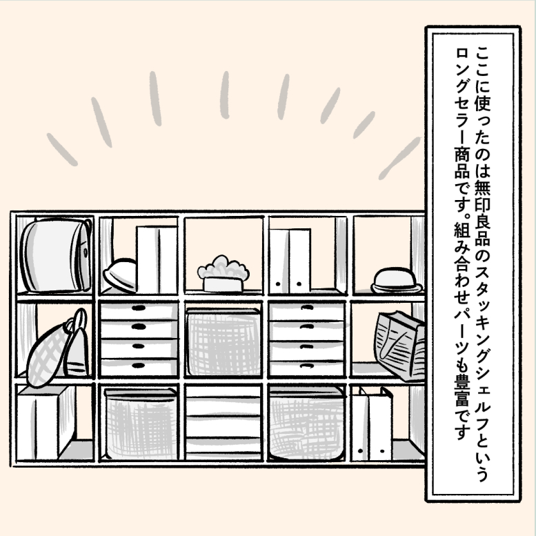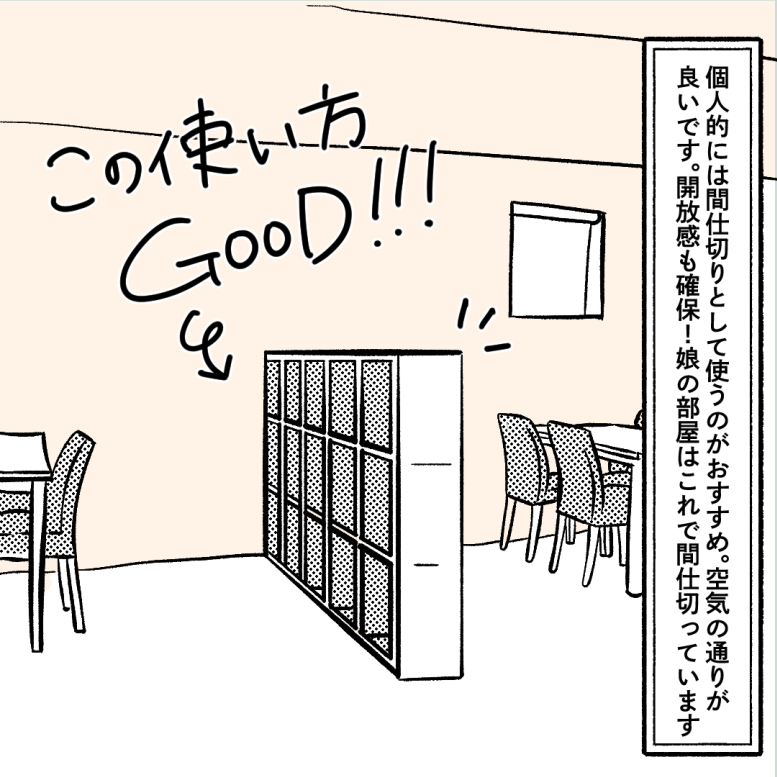 スタッキングシェルフ、使い方は無限大だけど、仕切りとして使うのが私は1番好きなんですよねえ。風も空気も熱も遮らない、一室空間として最も適した家具だと思いますねえ。