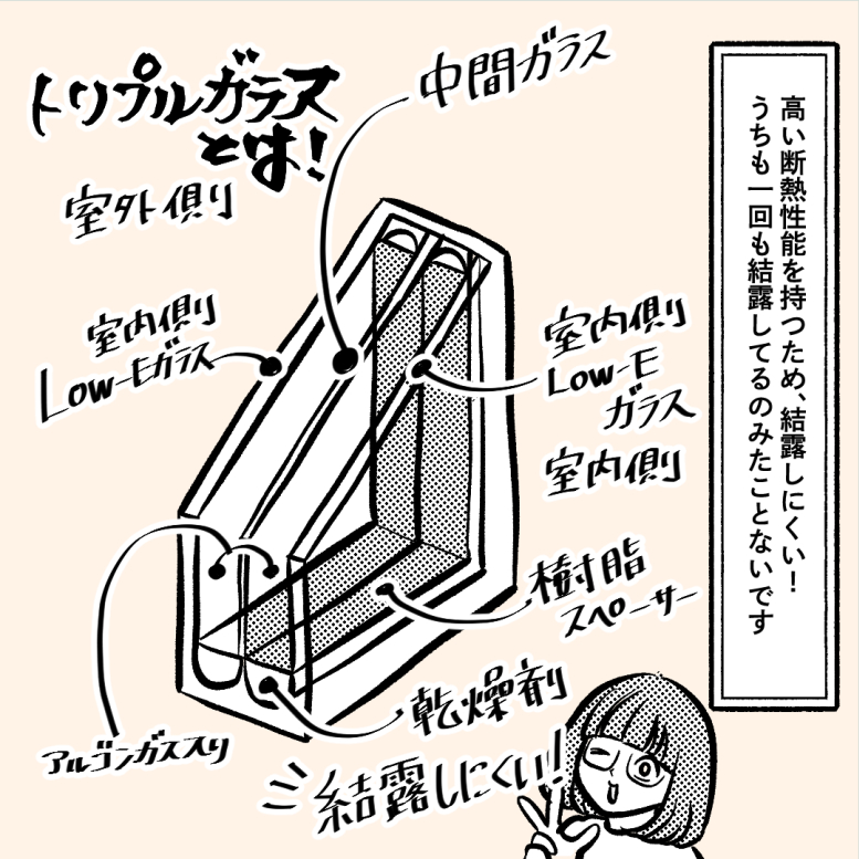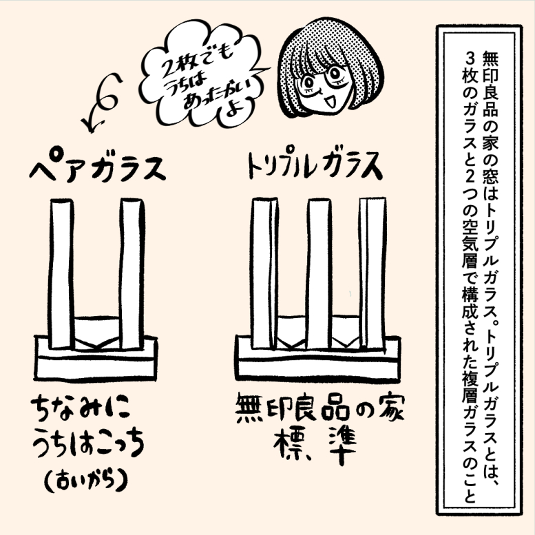 今回は窓の性能について。うちが建てられたのは13年前なのでその時は無印良品の家の標準窓がペアガラスだったんですが、現在はトリプルガラスを使っているそうだ。ちなみにうちは窓がさむいなーとか結露してるなーという感じは一度もないです!トリプルになったらどうなっちゃうんだろう…