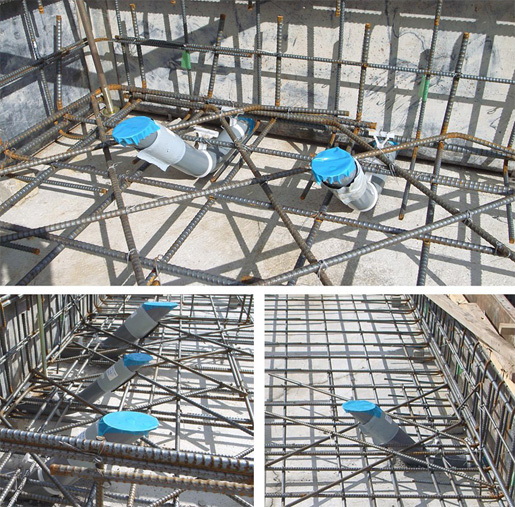 水色の帽子の管は、基礎のコンクリート内に埋設させないように、給排水&ガスの配管を通すためのもの。