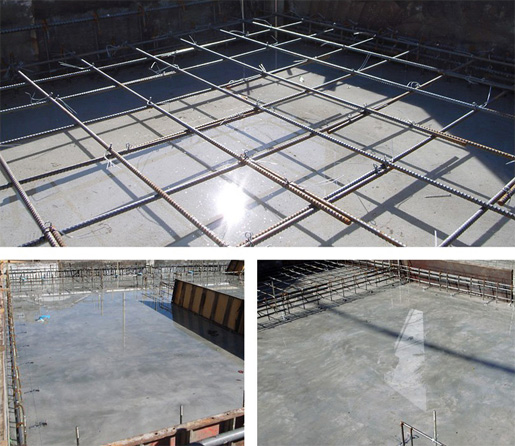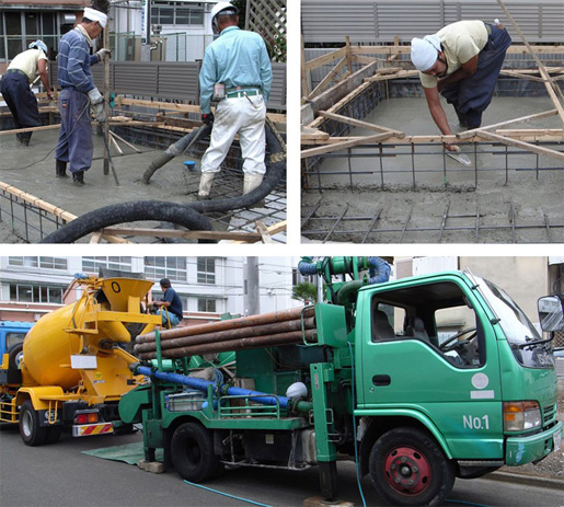 写真は、コンクリートを流す人、バイブの人、ならす人、の3人の職人さんたちです。
